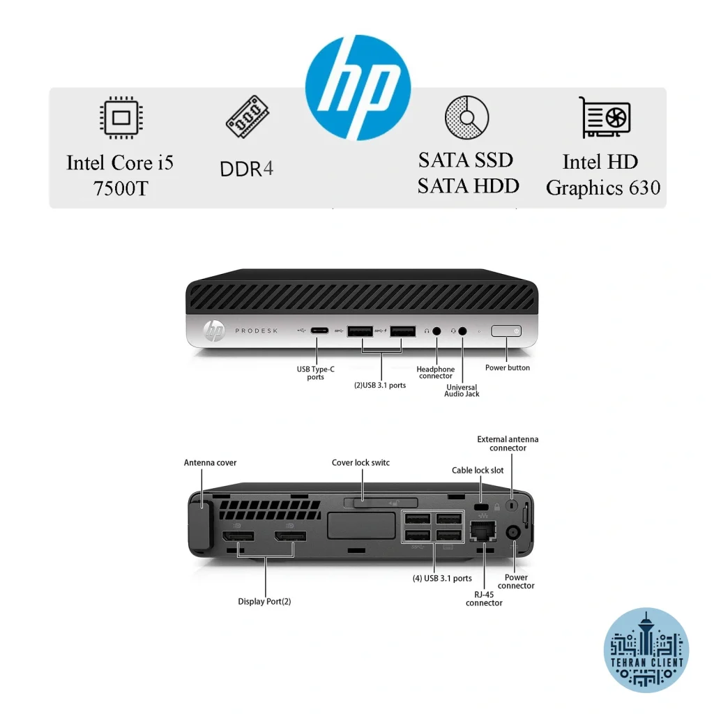 سومین محصولی که در این راهنمای خرید معرفی می‌کنیم، HP ProDesk 600 G3 است؛ یکی از مینی‌پی‌سی‌های قدرتمند سری HP که، ارزش خرید بسیار بالایی دارد. این دستگاه دارای پردازنده Intel Core i5-7500T  است؛ پردازنده‌ای چهار هسته‌ای با مصرف انرژی بسیار پایین که برای کارهای اداری سنگین‌تر، اجرای هم‌زمان چند نرم‌افزار، استفاده در محیط‌های سازمانی و حتی برنامه‌نویسی سبک عملکردی کاملاً روان ارائه می‌دهد.